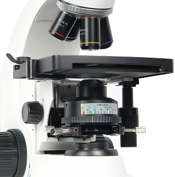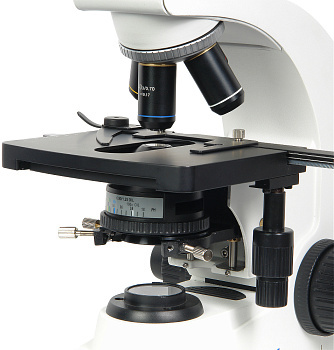 - Новый механизм фокусировки обеспечивает более точную настройку, что особо важно при работе с объективами большого увеличения. Рукоятка тонкой фокусировки имеет шкалу с ценой деления 1 мкм. Перемещение столика при повороте рукоятки тонкой фокусировки на 360° – 0,1 мм.