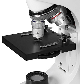 - Клеммы с пружинным механизмом позволяют удобно расположить препарат на предметном столике.