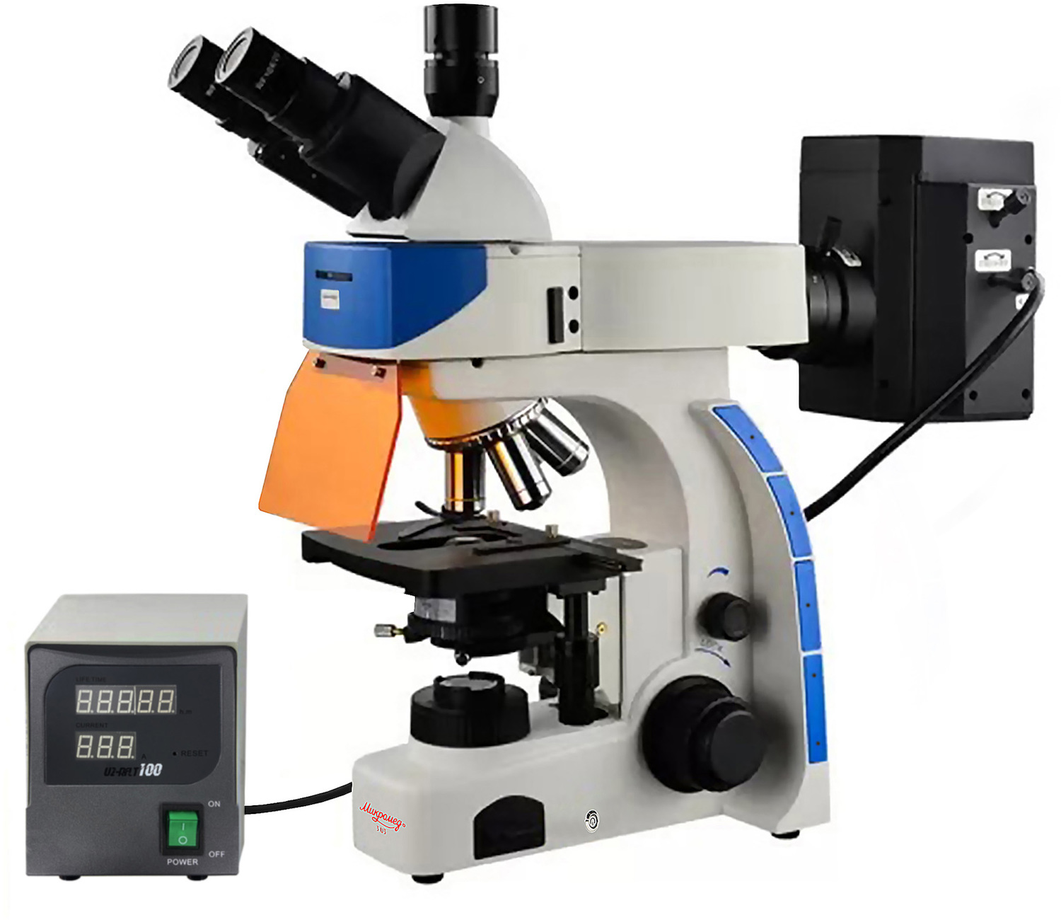 100 Вт ртутной лампой, зеркала, коллектора, полевой диафрагмы и оборудован переключаемыми люминесцентными блоками и слайдером световой заглушки.