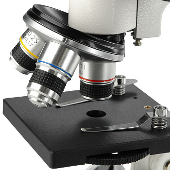 - Штатив и основание микроскопа с окулярным тубусом и револьвером на 3 гнезда