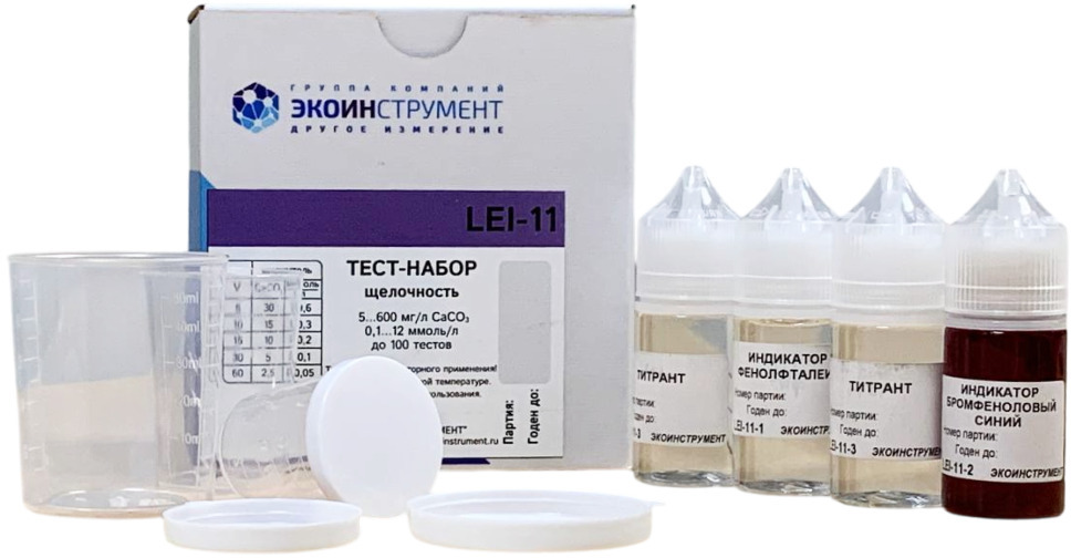 Титровальный набор для определения общей и свободной щелочности LEI-11 содержит необходимые реагенты и посуду, необходимые для выполнения анализа на щелочность.